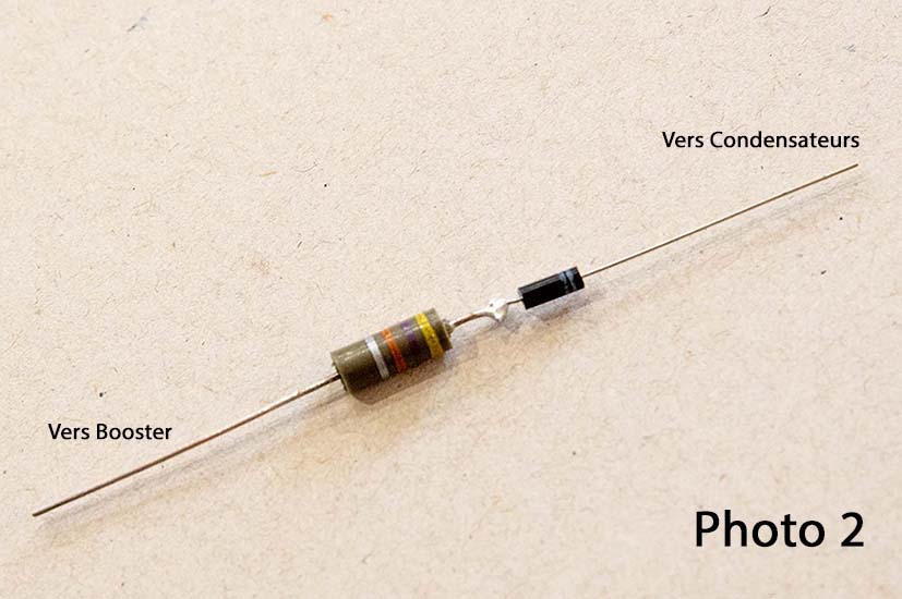 Orientation : l’anneau sur la diode identifie la cathode. C’est l’autre côté de la diode qui doit être souder avec la résistance. - Dessouder le fil blanc du module booster et le remplacer par l’ensemble résistance + diode (Photo3) :
